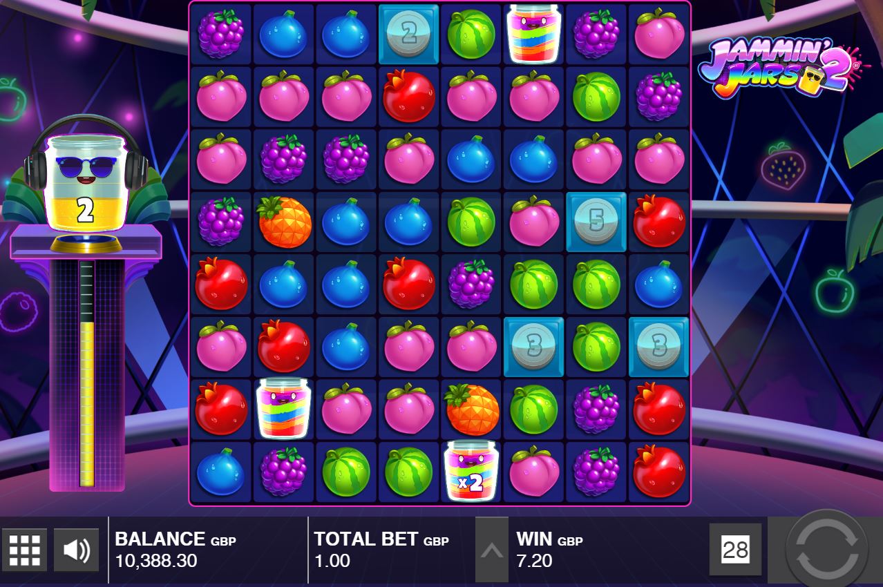 Eingebettet in einen der stimmungsvollsten Nachtclubs, die Sie je gesehen haben, garantiert Ihnen Jammin’ Jars Ihre fünf Portion Obst und Gemüse am Tag, während Sie unter der Discokugel feiern. Mit Rampenlicht und Tanzflächen-Lichteffekten im Hintergrund ist es ein fröhlicher Slot, den Push Gaming mit vielen leicht jam-basierten Funktionen ausgestattet hat.
